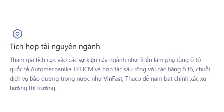 Là một đơn vị tham gia quan trọng vào thị trường phụ tùng ô tô tại Việt Nam, công ty luôn tuân thủ phương châm "chất lượng là trên hết, dịch vụ là trên hết" và đối tượng dịch vụ của công ty bao gồm các nhà sản xuất ô tô, cửa hàng 4S, xưởng sửa chữa và người tiêu dùng cuối cùng. Với sự hiểu biết sâu sắc về thị trường Việt Nam và năng lực thực thi hiệu quả, công ty đã đạt được mức tăng trưởng bình quân hằng năm trên 30% về quy mô kinh doanh trong nhiều năm liên tiếp, đứng đầu ngành.